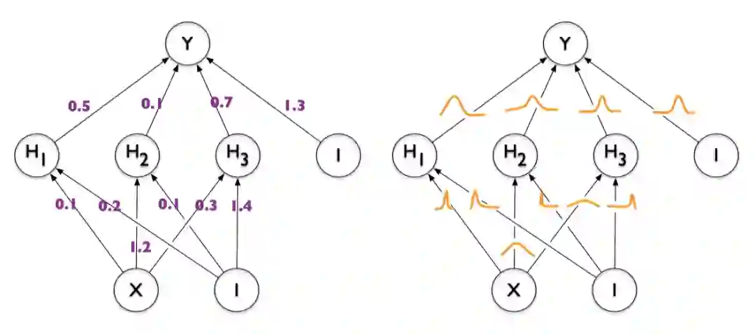 ▲ 图2. 参数固定的传统神经网络(左)以及参数服从概率分布的贝叶斯神经网络(右)