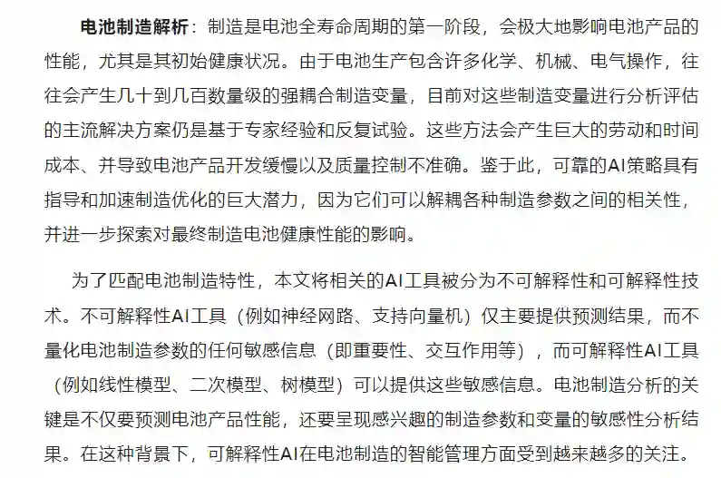 1)对于电池制造,在介绍了电池生产的基础知识后,讨论了基于AI的电池制造数据分析框架和相应的AI工具,以实现有利于电池初始健康性能提升的智能制造。