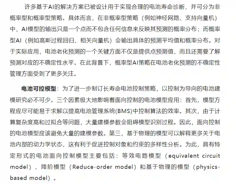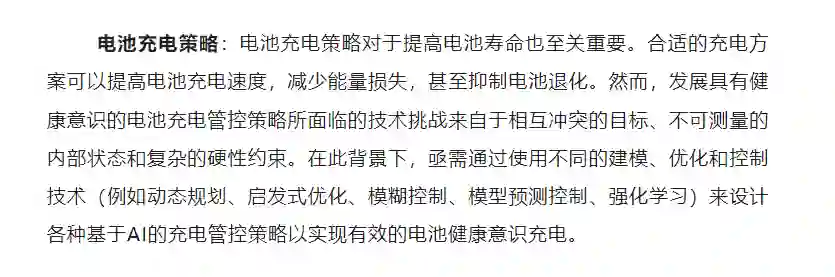 4)针对电池寿命的提升,对各种可控电池模型、具备健康意识的电池充电方案与相应的AI技术进行了调查讨论。
