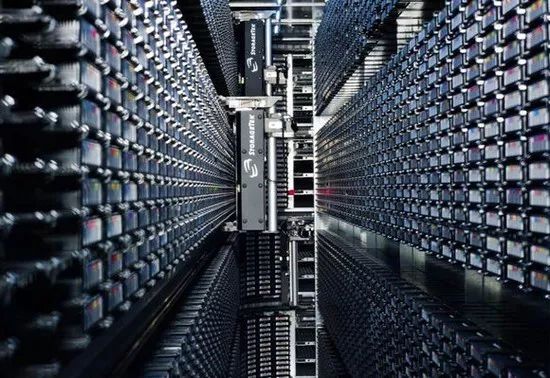 CERN计算机中心的自动磁带存储库(2008年),磁带用来存储LHC的实验数据,机械臂用于在存储架和驱动器间运送磁带,磁带的调用完全自动化(图片来自网络)