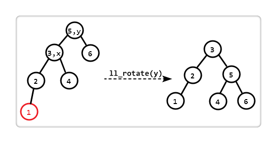 我们只需对 "以 y 为根的子树" 进行 "左左旋转 (ll_rotate)" 即可。一次旋转后,恢复平衡。