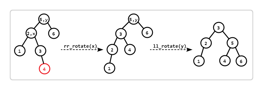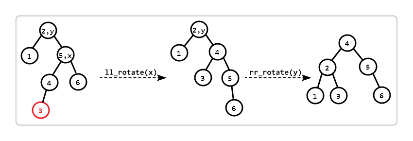 观察发现,若先对 "以 x 为根的子树" 进行 "右右旋转 (rr_rotate)",此时 "以 y 为根的子树" 恰好符合 "左左失衡",所以再进行一次 "左左旋转 (ll_rotate)"。两次旋转后,恢复平衡。
