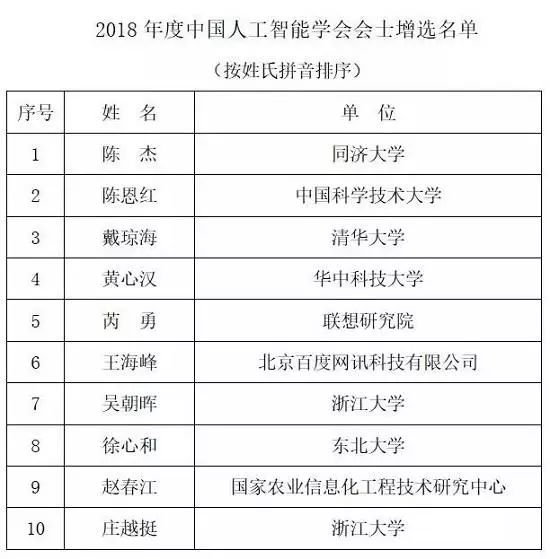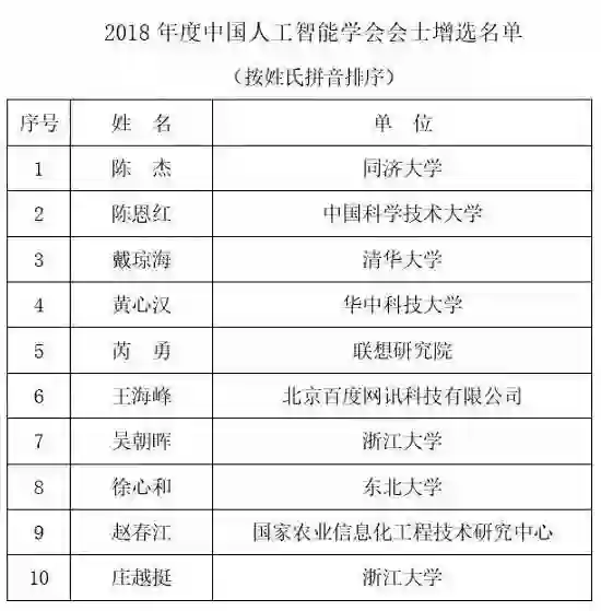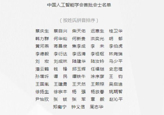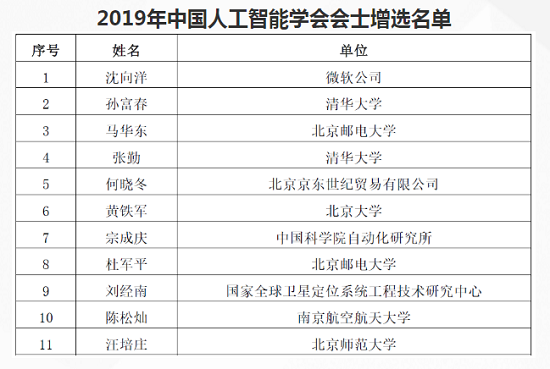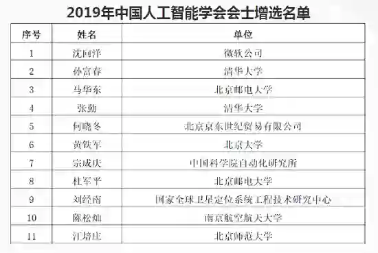 2019 年 10 月 8 日,中国智能科学技术领域唯一的国家级学会——中国人工智能学会(CCAI)正式公布 2019 年中国人工智能学会会士(CAAI Fellow)增选名单,微软沈向洋博士、清华大学孙富春教授、京东何晓东博士、北京大学黄铁军教授、中科院自动化所宗成庆研究员等 11 位来自学术界和工业界的科学家位列公示名单。