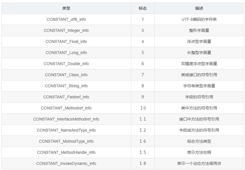 我们也可以把常量池当做一个数组(常量池中的每一项常量都是一个表),与一般数组不同的是,常量池数组中不同的元素类型,结构都是不同的,长度当然也不相同;但是每一个元素的第一个数据都是u1类型,该字节是个标志位,占一个字节。JVM在解析长量池时,会根据这个u1类型来获取元素的具体类型。目前,常量池中出现的常量类型有14种,如下表: