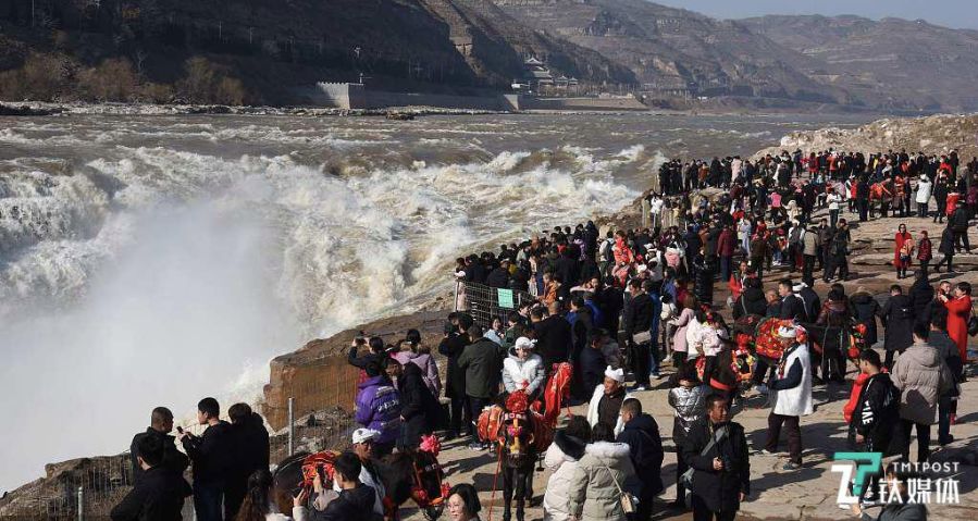 2月5日,山西临汾,众多游客在山西吉县黄河壶口瀑布景区游览观瀑。