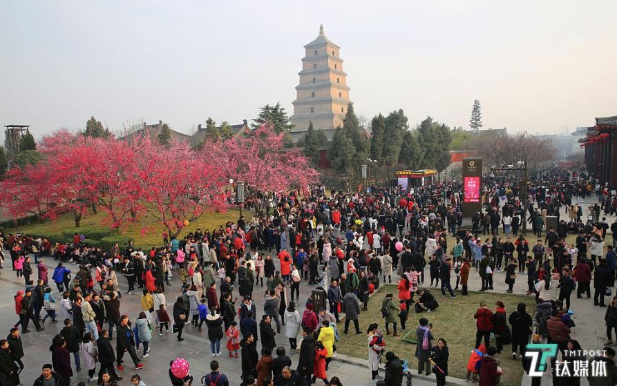 2月5日正月初一,西安大雁塔下汹涌的人潮如蚂蚁般涌动。