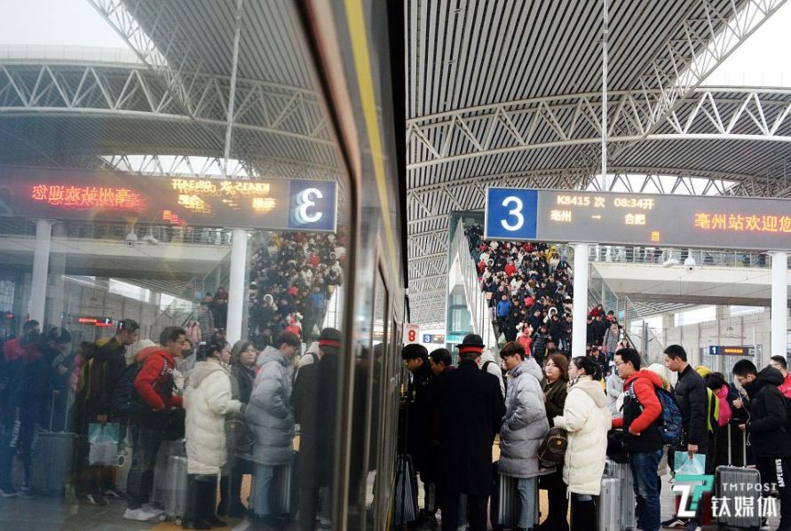 2月10日,在安徽省亳州火车站,返程旅客正在进站上车。