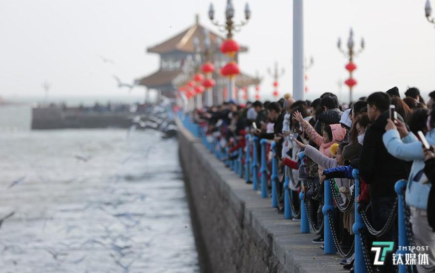 2月5日,人们在山东省青岛栈桥景区赏海鸥过大年。