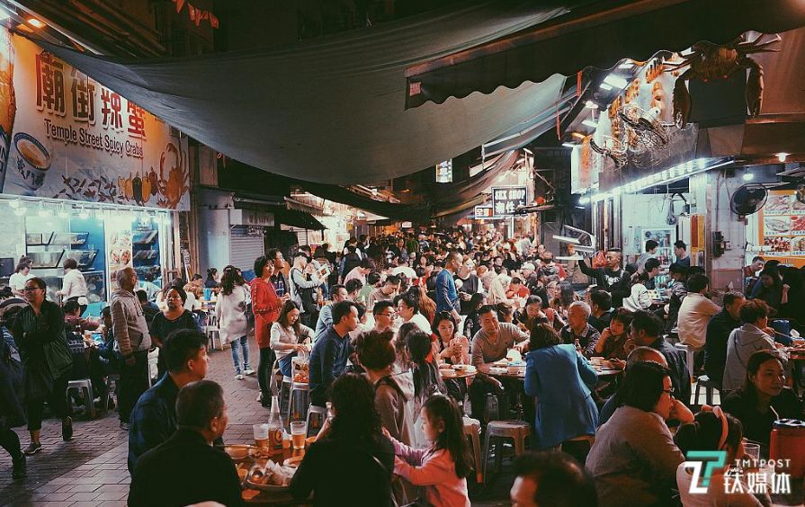 2月5日大年初一,香港九龙油麻地附近的庙街,各类小吃大排挡满座,各地游客和本地原住民来来往往接踵摩肩,年味十足。