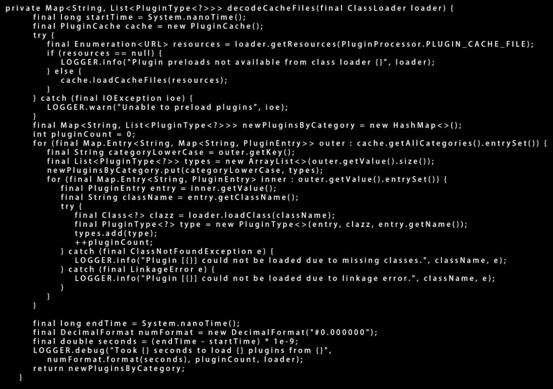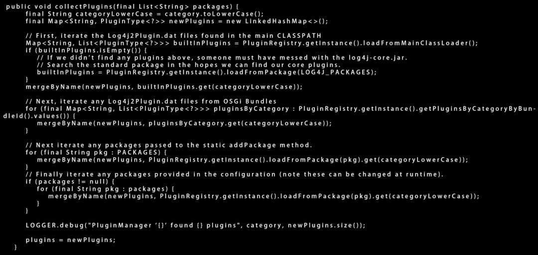 逻辑还是比较简单的,但是我在看源码的时候发现了一个很有意思的东西,就是在加载log4j2 core插件的时候,也就是