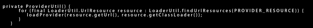 这里的懒加载其实就是懒加载Provider对象。在创建新的providerUtil实例的过程中就会直接实例化provider对象,其过程是先通过getClassLoaders方法获取provider的类加载器,然后通过loadProviders(classLoader);加载类。在providerUtil实例化的最后,会统一查找”META-INF/log4j-provider.properties”文件中对应的provider的url,会考虑从远程加载provider。而loadProviders方法就是在ProviderUtil的PROVIDERS列表中添加对一个的provider。可以看到默认的provider是org.apache.logging.log4j.core.impl.Log4jContextFactory