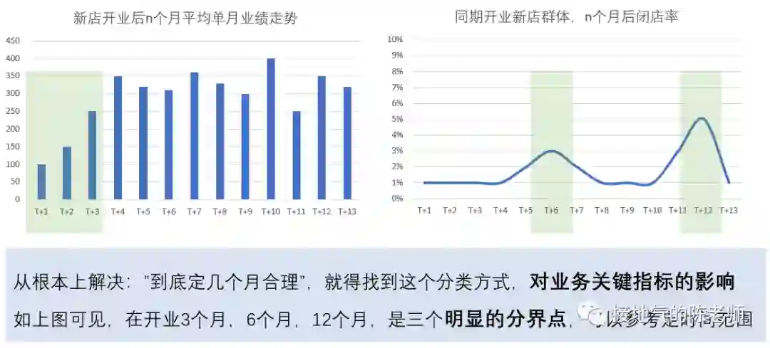 此时,虽然没有明确标准,但是业务给出找标准的方法。我们可以统计所有门店的生命周期数据,看闭店概率/营业额/订单量的拐点在哪里,从而清晰标准(如下图)。