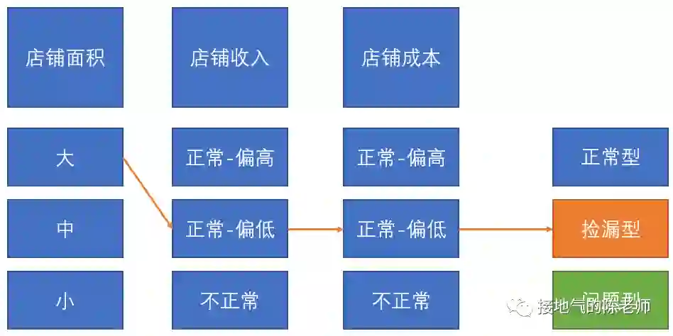 常见复杂情况二:两个/多个基础标签合并出来的标签(又称综合计算标签)。比如“捡漏店”,潜台词是:这个店面积很大,但店租比正常低,同时客流并没有比正常少很多,因此被我们捡漏了。这个时候,捡漏店是有三个基础标签拼接出来的(如下图)。
