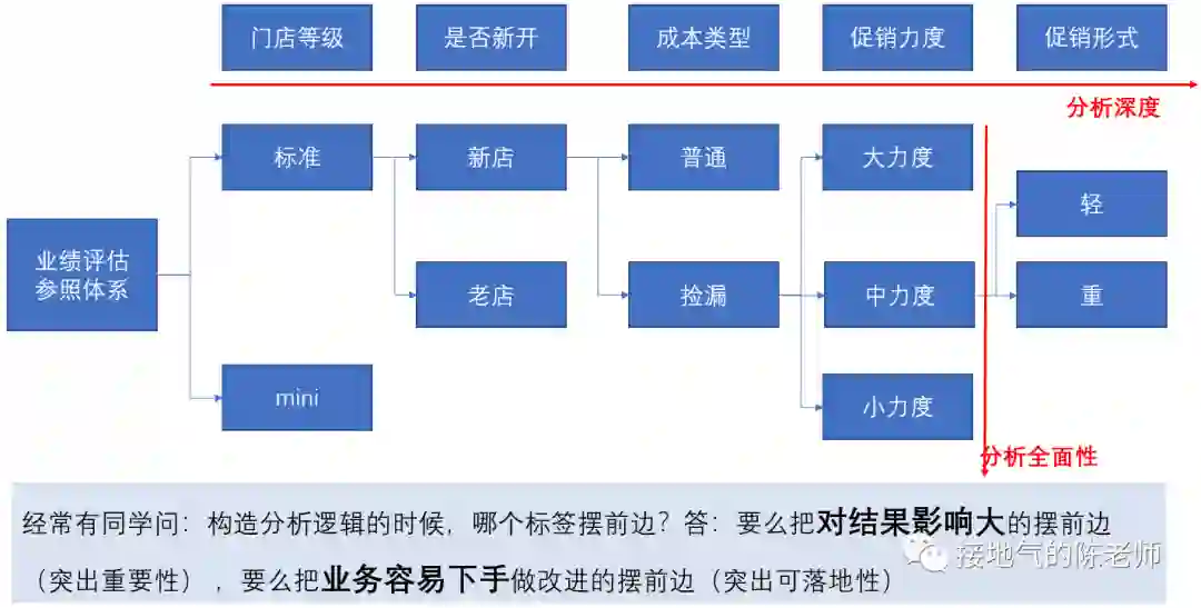 如果有多个标签叠加,则可以构建复杂的分析逻辑,一层层进行推导。这种复杂的分析逻辑,就是我们常说的“深入分析”,一般习惯性,把考虑了很多种情况,称为“分析全面”,把推导了多少层,称为“分析深入”(如下图)。