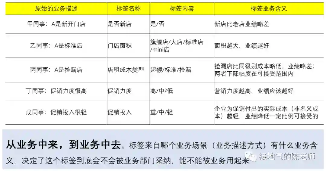 这里最大的问题,在于业务讨论的各种细节,无法直接表示成一个数据指标,导致量化都做不了,更不要提分析了。而量化业务的关键在于贴标签。