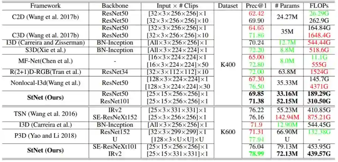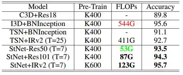 表 3:StNet 和几种最先进的基于 2D / 3D 卷积的解决方案的比较。该结果通过在 Kinetics400 和 Kinetics600 的验证集上得到,其仅具有 RGB 模态。