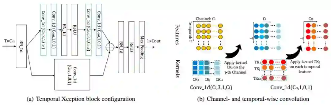 4. 对 pooling 出来的 T 个特征向量,不同于简单的取平均操作,本文提出了时序 Xception 模块,进行进一步的时序关系捕获来获取最终的视频特征向量。时序 Xception 模块的设计主要基于时序 1 维卷积,类似 2D 卷积的 Xception 设计,这里采用了 channel-wise 和 temporal-wise 分离的策略以进一步减少计算量与模型参数量。