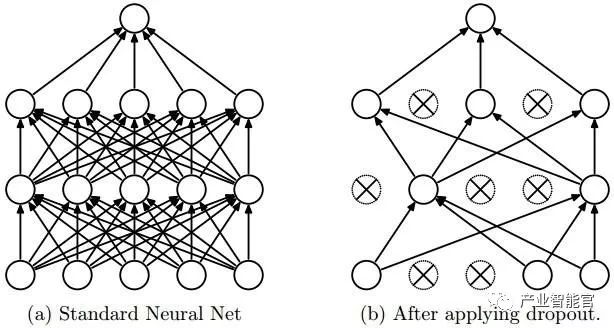 Dropout 可以很好地解决这个问题。Dropout说的简单一点就是在前向传导的时候,让某个神经元的激活值以一定的概率p停止工作,示意图如下: