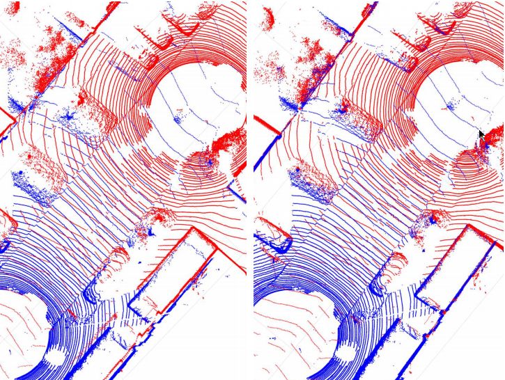 图3. 成功配准的两个激光雷达图,该数据来自KITTI里程计数据集。左边是在有RTK-GPS数据下的的初始位姿。右侧是通过HMRF改进的ICP算法配准结果,而且是没有使用数据拓扑的信息(即RTK-GPS数据)。