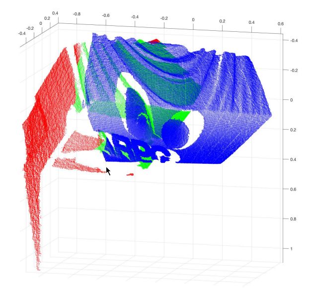 如图2所示,成功配准的点云之间只有36%的重叠率。蓝色的点是基准点云,绿色和红色代表待配准点云。根据HMRF方法推断,绿色的点是内点,红色的点是外点。