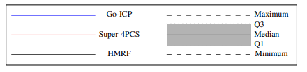 作者通过Go-ICP、Super 4PCS 两种算法与利用HMRF改进的ICP算法(本文算法)进行了性能的对比,总的来说,不管是平移还是旋转错误率还是算法所消耗的时间,HMRF ICP优于另两种算法,其对比图如下: