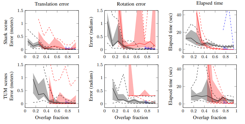 作者通过将对应点之间的距离建成一个混合模型,这个模型具有两个分布:用于内点的正态分布和针对外点的逻辑分布。利用图像分割技术,通过隐马尔可夫随机场将一个点的内点/外点的状态建成受近邻点的影响模型——邻点先验。通过应用这个邻点先验,隐马尔科夫模型能够推断出在高重叠率或低重叠率时,哪些点不在重叠域中。