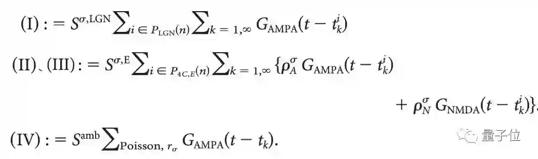 而E电导率gE^n(t)是四个突触传导的总和,分别来自LGN,4Cα层,第6层和大脑或身体其他部位的神经调节的影响。