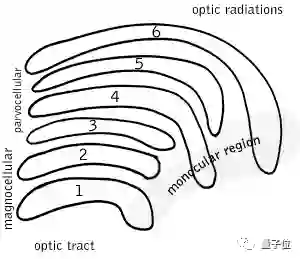 灵长类动物的LGN有六层,其中第1、4、6层接收一只眼的信息,第2、3、5层接收另一只眼的信息。