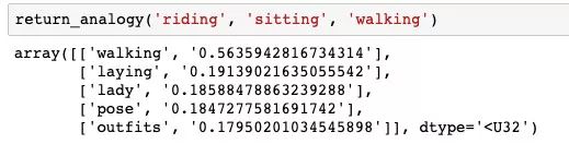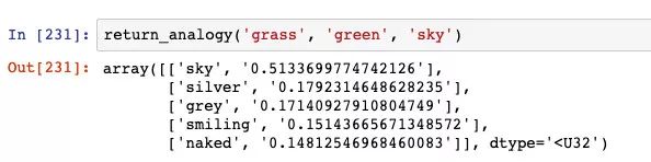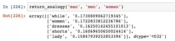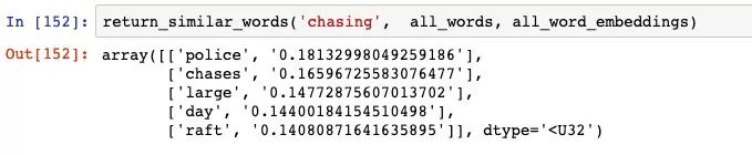 我们可以使用 100 维表示来构建一个函数,该函数可找出与输入单词最相似的单词。它的工作原理很简单:采用 100 维的表示,并找出它与数据库中所有其他单词的余弦相似度。