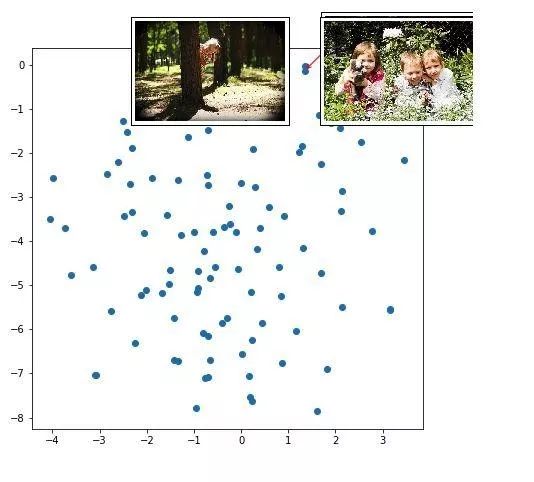 这些点是不同图像的表示(我没有使用全部的 8K 图像,只使用了大约 100 张图像样本)。红色箭头指向附近一组表示的聚类。