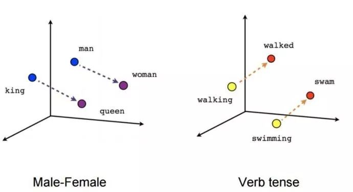 关于词嵌入的一个振奋人心的事实是,你可以对它们进行微积分计算。你可以用两个单词(如「king」和「queen」)减去它们的表示来得到一个方向。当你把这个方向应用到另一个词的表示上(如「man」),你会得到一个与实际的类比词(比如「woman」)很接近的表示。这就是为什么 word2vec 一经推出就如此受欢迎: