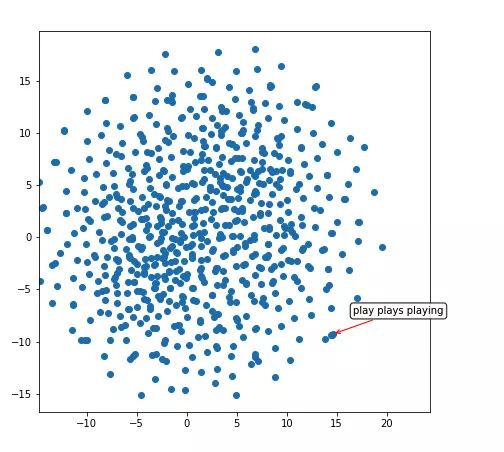 因此,我们的网络已经了解到像「play」、「plays」和「playing」这样的词汇是非常相似的(它们具有相似的表示,如红色箭头所示的密集聚类)。让我们看看这个二维空间中的另一个区域: