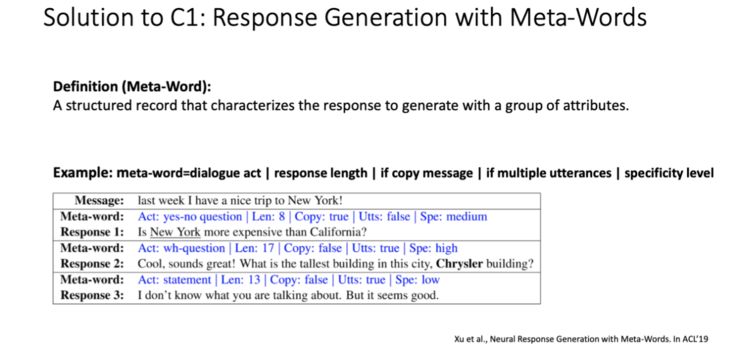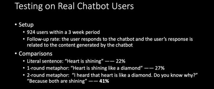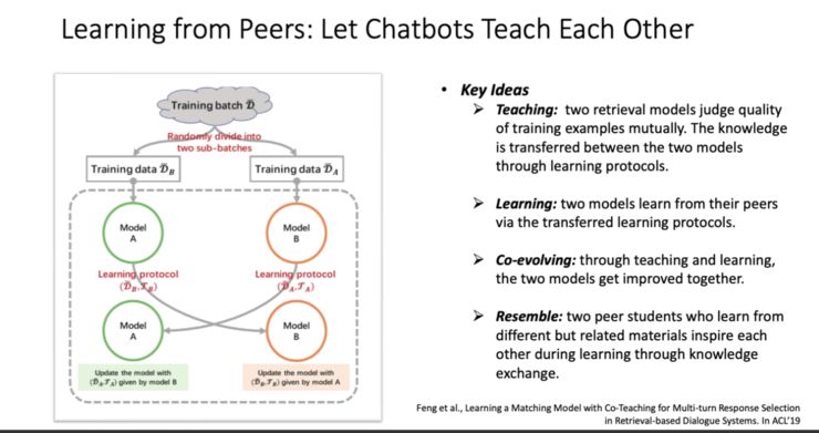 第一,学习能力。学习是人类发展进化并走向成熟的一个基本能力,对于对话机器人而言亦然如此。而对话机器人的学习能力有两个层次,一是能够从人类的对话中学习怎样去说话;二是当对话机器人发展得越来越成熟之后, 每个机器人可能都在各自专注的领域有很丰富的知识那是否有可能让这些机器人之间互相学习,从而实现信息共享和能力互补呢?