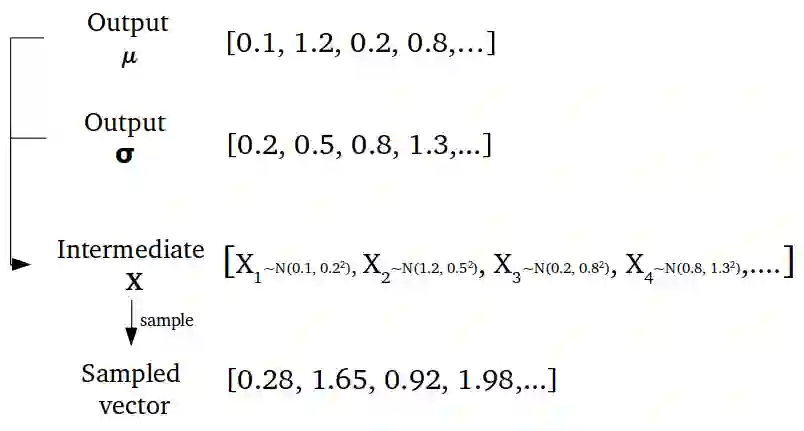 它们构成了长度为n的随机变量向量的参数,μ的第i个元素和σ是我们抽样的第i个随机变量X i的平均值和标准差,并用它们获得采样编码,然后传给解码器: