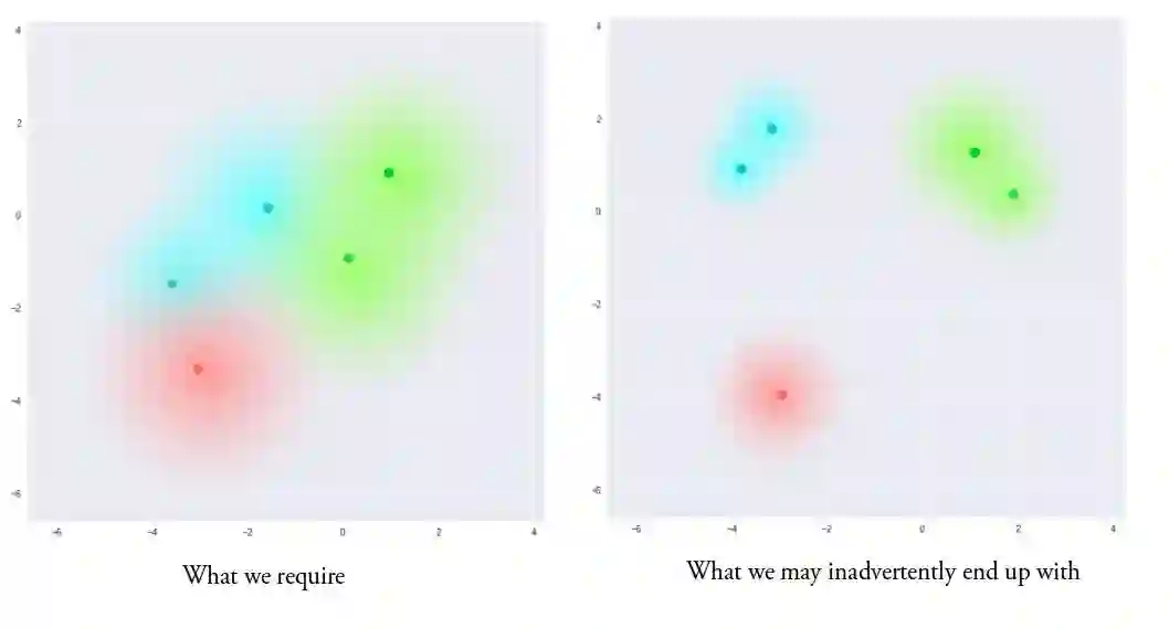 直观地说,这是由重建损失的集群形成性质和KL损失的密集包装性质达到的平衡,形成解码器可以解码的不同簇。 这很好,因为它意味着当随机生成时,如果从编码向量的相同分布(N〜(0,I))中采样一个向量,则解码器将成功解码它。 而且,如果你正在插入,那么在簇之间没有突然的间隙,但是一个平滑的组合特征是解码器可以理解的。