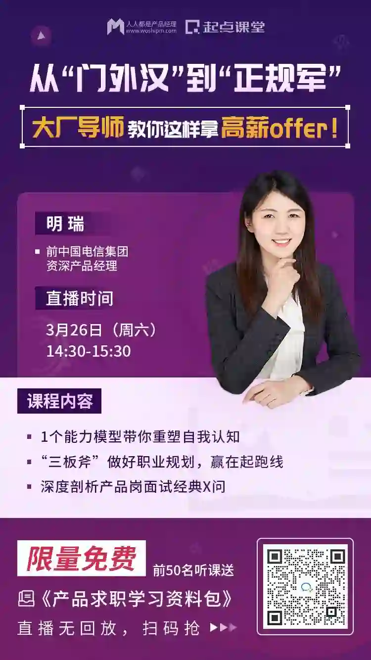 还是不清楚到底该怎么着手做?没关系,针对以上这些问题,3月26日下午14:30-15:30,【人人都是产品经理】联合【起点课堂】特邀原中国电信集团资深产品经理@明瑞,做客“产品经理入门公开课”。