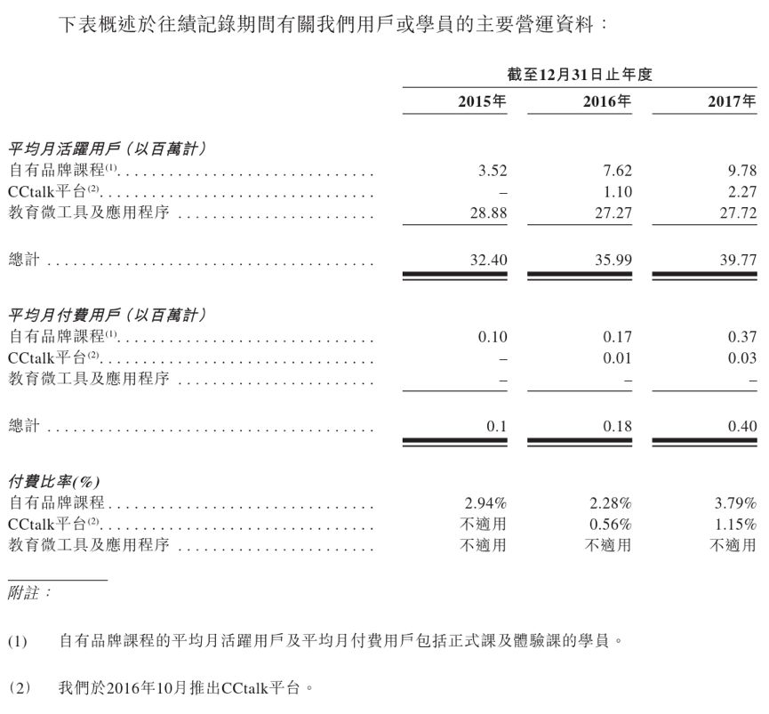 在第三方教育从业者方面,截至2017年12月31日,共有2187家商户和41534名自雇网师在CCtalk平台上注册,这一数字在2016年12月31日时,分别为992和11,831。课程数量也从2016年底的37,707门增长至2017年底的73,795门。