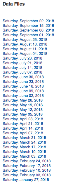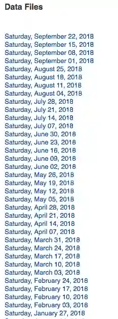 从2010年5月至今,这些旋转门的数据被按周汇总,因此网站上存在数百个.txt文件。下面是一些数据片段,每个日期都是可供下载的.txt文件的链接。