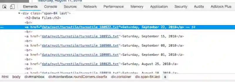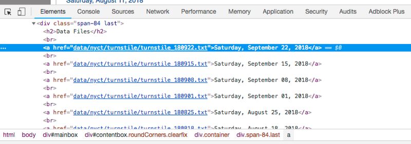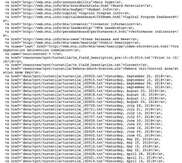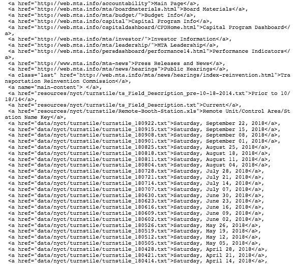 <a href=”data/nyct/turnstile/turnstile_180922.txt”>Saturday, September 22, 2018</a>