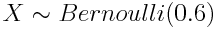 上式表示随机变量 X 服从成功率(正面向上)为 0.6 的伯努利分布。