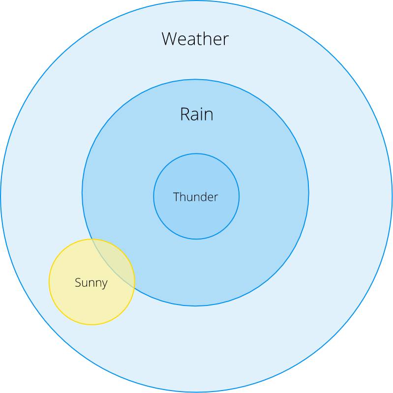 从这个欧拉图,我们可以看到 P(Rain | Thunder)= 1 :当我们看到雷声时,总会下雨(当然,这不完全正确,但是我们在这个例子中保证它成立)。