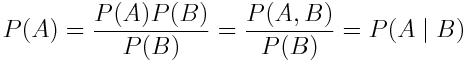 如果我们从右到左阅读上式,我们会发现 P(A | B) = P(A)。这就意味着事件 A 独立于事件 B!P(B)也是一样,独立事件的解释就是这样。