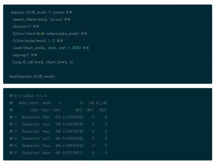 所以,利用你原始的 Prince 的数据框和经过过滤的标记词,并且消除不受欢迎的词汇,但是保留停词。然后使用 bind_tf_idf() 运行公式并且建立新的列。