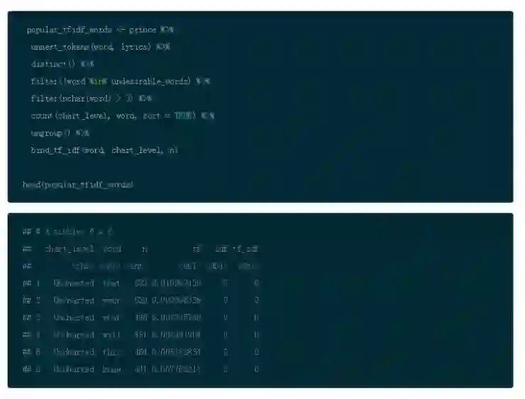 现在如你所见,对于最最常见的单词,IDF and TF-IDF 都是 0.(更科学地说,IDF 的表现形式是自然对数 ln(1),所以那些词汇的 IDF 以及 TF-IDF 的值是 0.)把你的结果作为参数传递给 arrange() 然后以降序的方式展示 tf-idf。通过增加这些步骤,你会以一种不同的视角观察 Prince 的歌词。