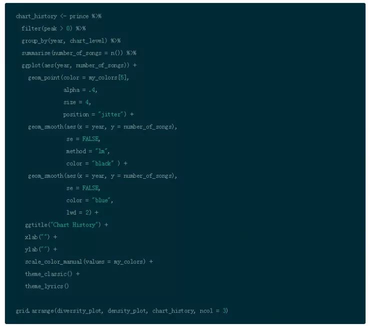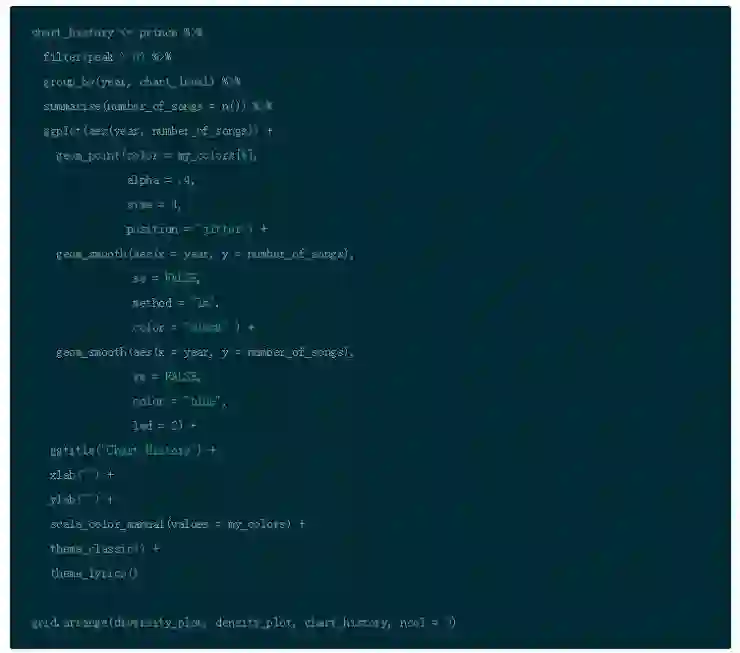 为比较趋势,可以可视化打榜历史数据(例如:打榜成功的歌曲)和比较其多样性和密度。使用 gridExtra 的 grid.arrange() 函数并排地绘图。