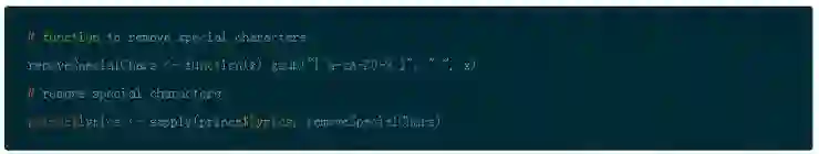 你还将注意到特殊字符弄脏了文本。你可以用 gsub() 函数和简单的正则化表达式来去除它们。 请注意,在这步骤之前,扩充收缩是非常重要的!