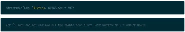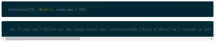 在文本挖掘中调整数据的另一个普遍的步骤是词干,或者叫拆分单词为它们的词根含义。这是可以在以后讨论的话题,现在,看一下 Prince 的数据框架。