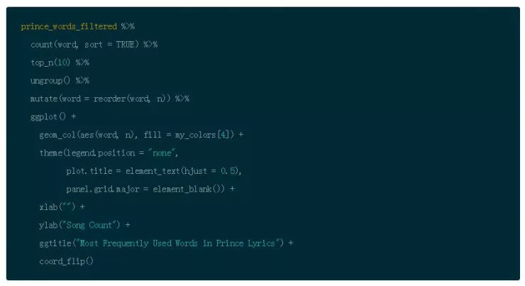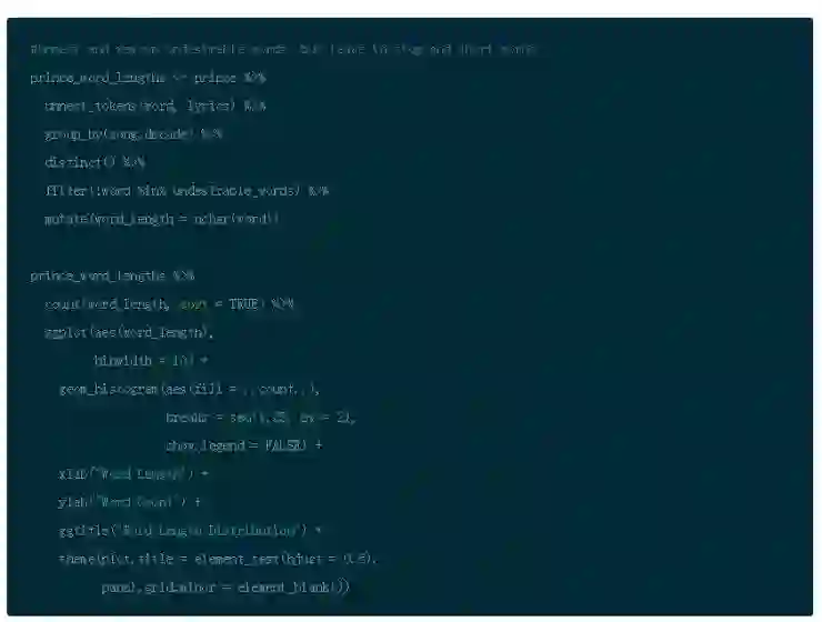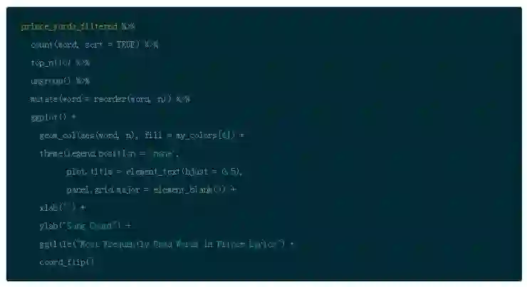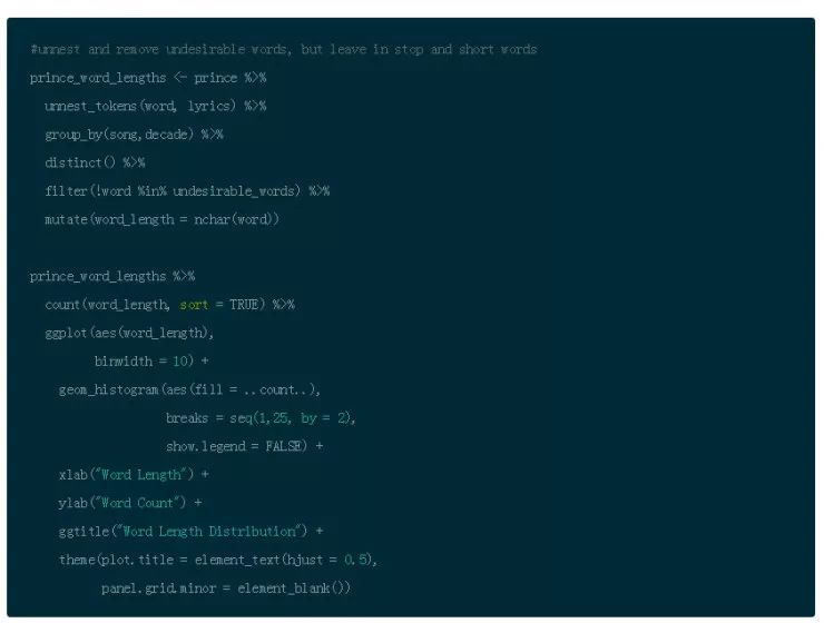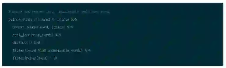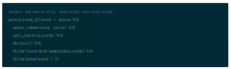 因此,在你将歌词标记为单词之后,使用 dplyr 的 anti_join() 函数删除停止单词。接下来,使用 dplyr 的 filter() 函数和 %in% 操作符来删除之前定义的不想要的单词。然后使用 distinct() 来去掉重复的单词。最后,你可以删除所有少于 4 个字符的单词。这是另一个主观决定,但是在歌词中,很多感叹词比如 “是, 嘿”,然后把结果存到 prince_words_filtered。