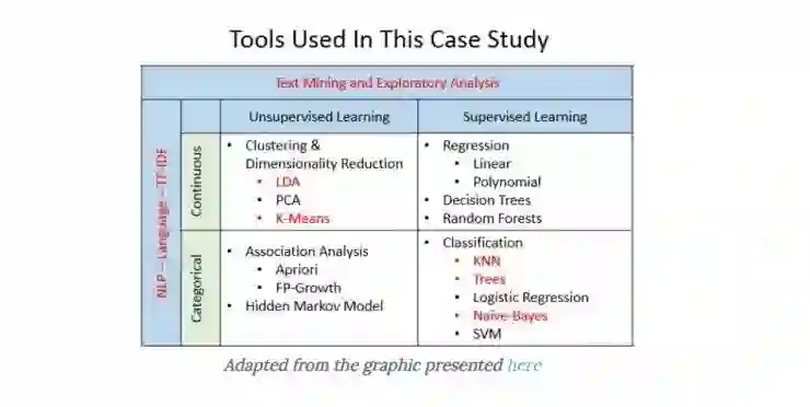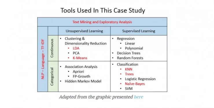 总之,歌词分析有很多方法。这些教程覆盖了下面图表中高亮红色的部分。注意的是这个图表是一个非常模糊的图片的简单的高级表示,并不代表图片本身。事实上,建模和机器学习的很多方面都是模糊的,并不一定适合下面展示的单一框。所以,在看图片时带上 3D 眼镜可能会更有意义!