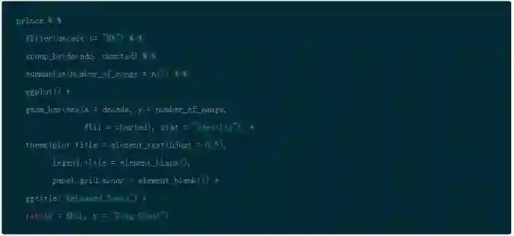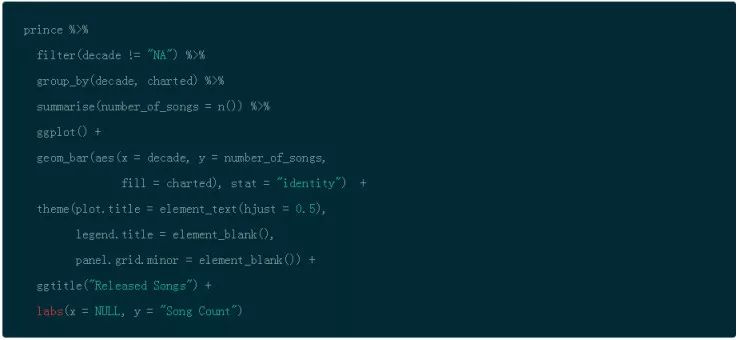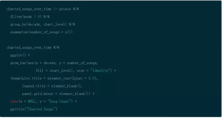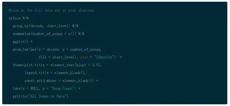 通过使用 dplyr 的 filter(),group_by() 以及 summarise() 函数,你能够按照 decade 来分组,然后计算出歌曲的数量。函数 n() 是多个聚合函数之一,也是对于在分组数据上使用 summarise() 有用的。然后使用 ggplot() 和 geom_bar() 创建条形图然后将分类填充到条形图中。